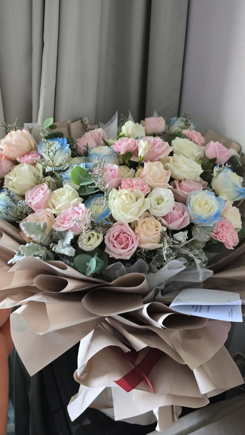 Avalanche Pink Rose (12-14 stalks), White Rose (10-11 stalks), Tinted Pink Rose (3-4 stalks), Tinted Icy Blue Rose (8-9 stalks), Pink Carnation (4-5 stalks), White Eustoma, Dusty Miller, Purple Caspia & Eucalyptus Leaves